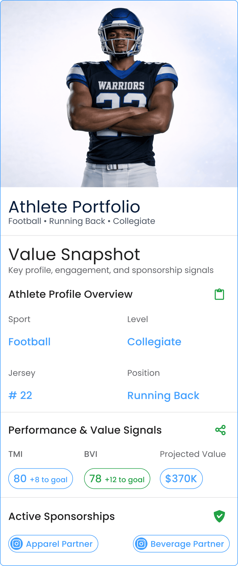 Bring athlete profile context, audience value signals, and brand readiness into one view.